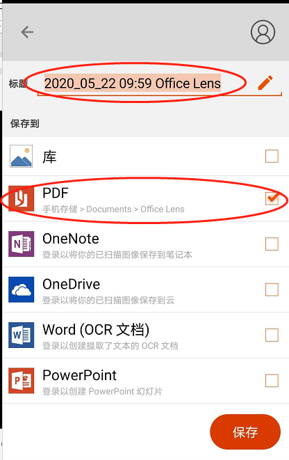 (3) Microsoft lens扫描结束保存的时候选pdf,其他的不要选修改文件名为“考试科目+姓名”(如图4)