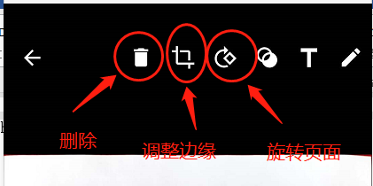 (2) 如果扫描结果有误,点击左下方的图片进入编辑页面,可以把页面删除、调整边缘或者旋转页面(如图2、图3)