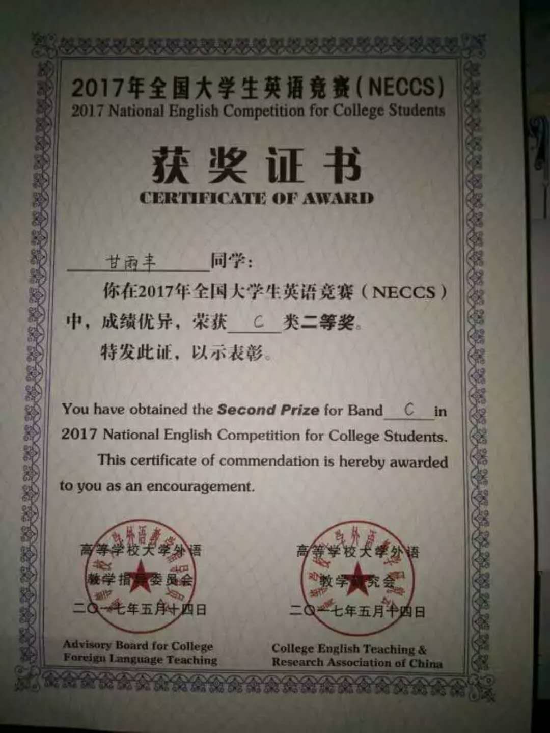 2017年参加全国大学生英语竞赛获得了C类二等奖,其实在这样一所工科大学中,能够坚持认真学习英语的人实属不多,我高考前对于英语近乎偏执的热爱还是给自己带来了一定的优势,虽然直接接触英语的机会减少很多,但是平时在代码的编写和资料的查询过程中还是会或多或少的接触到。英语竞赛之前我有把前期的竞赛试题拿出来练习过,靠着阅读积累的语感,最后也还算有不错的结果,英语这样的学科,是需要真正投入感情的。