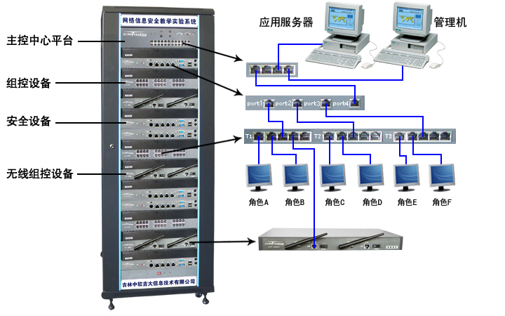 信息安全实训平台具备完整的信息安全教学实验体系,包括知识类实验和课题类实验,涉及社会工程学、密码学、主机安全、网络攻防、病毒攻防、容灾备份、无线安全和生物特征等八个方面。平台由硬件系统、软件系统及其配套的实验教程组成,实验教程包含了详细的实验原理和具体的实验步骤,硬件系统包括主控中心平台、安全设备、组控设备、应用服务器和管理服务器,软件系统包括网络信息安全教学实验平台、应用服务软件包、实验教学管理系统等。