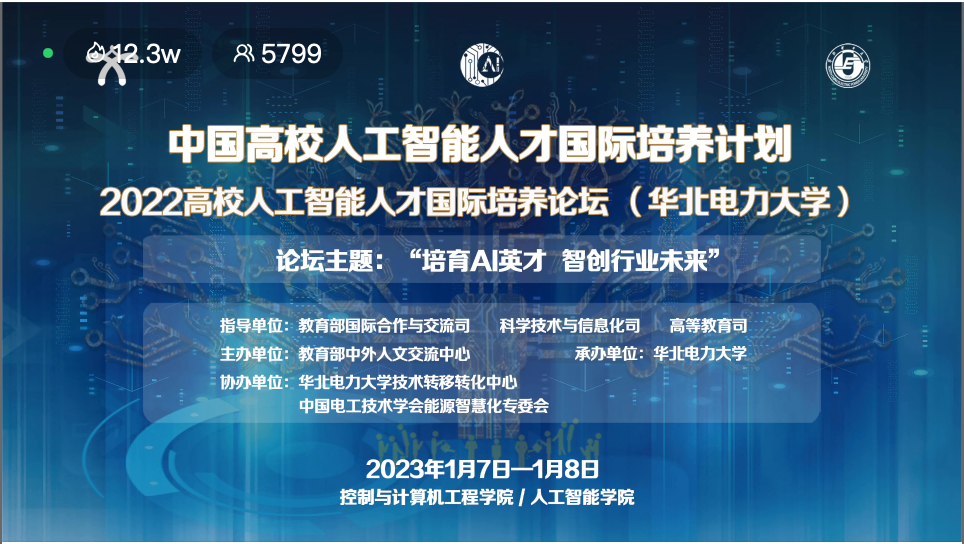 2023年1月7-8日,由教育部国际合作与交流司、高等教育司、科学技术与信息化司指导,教育部中外人文交流中心主办,av视频 承办,av视频 技术转移转化中心、中国电工技术学会能源智慧化专委会协办的“中国高校人工智能人才国际培养计划”2022高校人工智能人才国际培养论坛(av视频 )顺利举办。